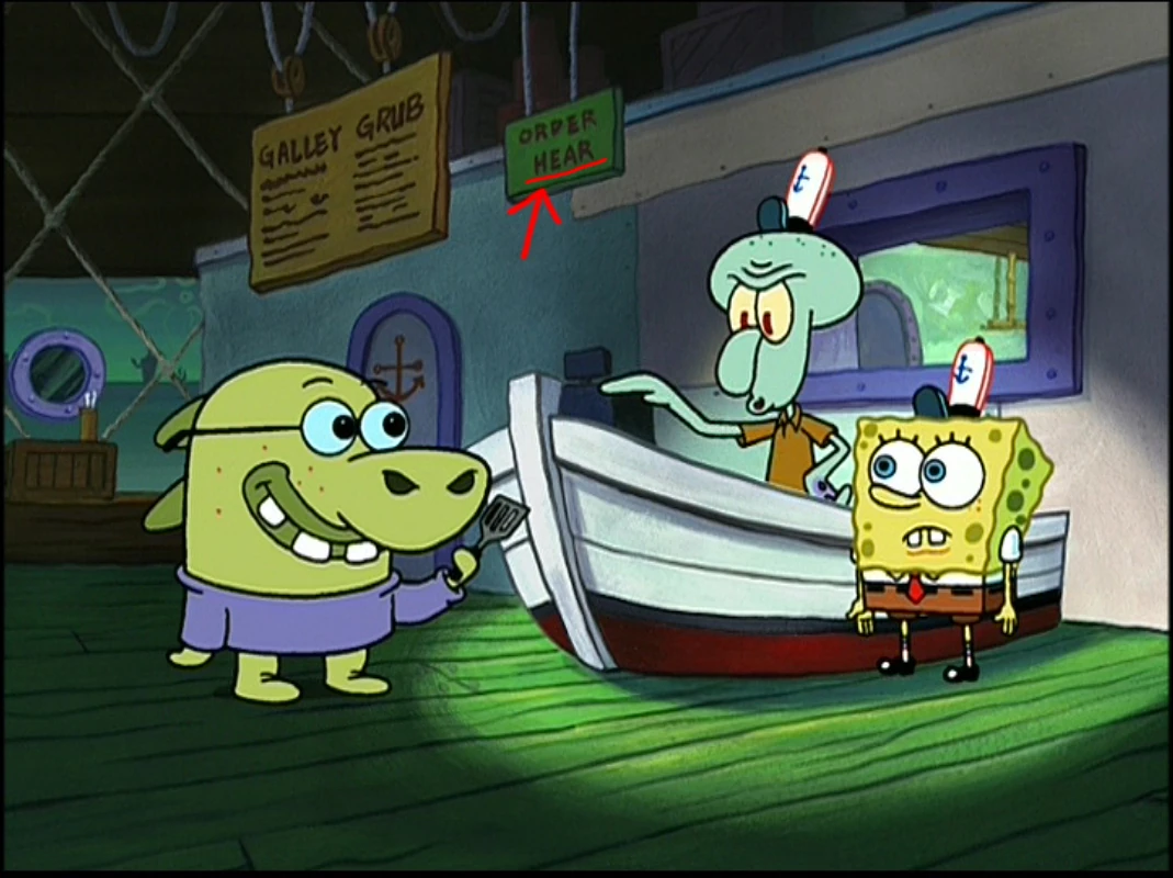 - The Galley Grub sign reads "Gally Grub" at one point in the episode. At another point, the Order Here sign reads "Order Hear."