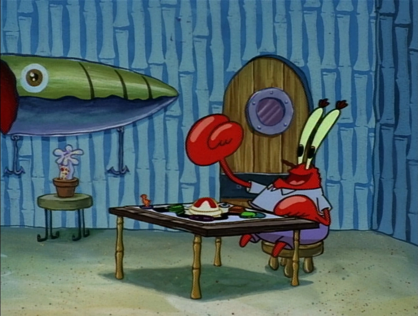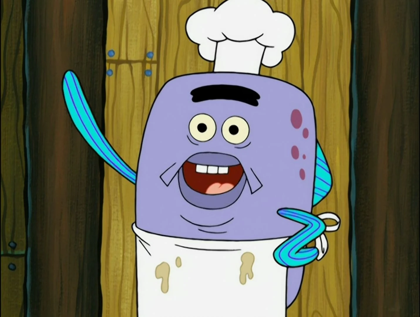 - In "Nasty Patty," He helped Mr. Krabs create a tainted patty to "kill" the health inspector. They both thought the health inspector was a fake one and even put the nastiest things on the patty.