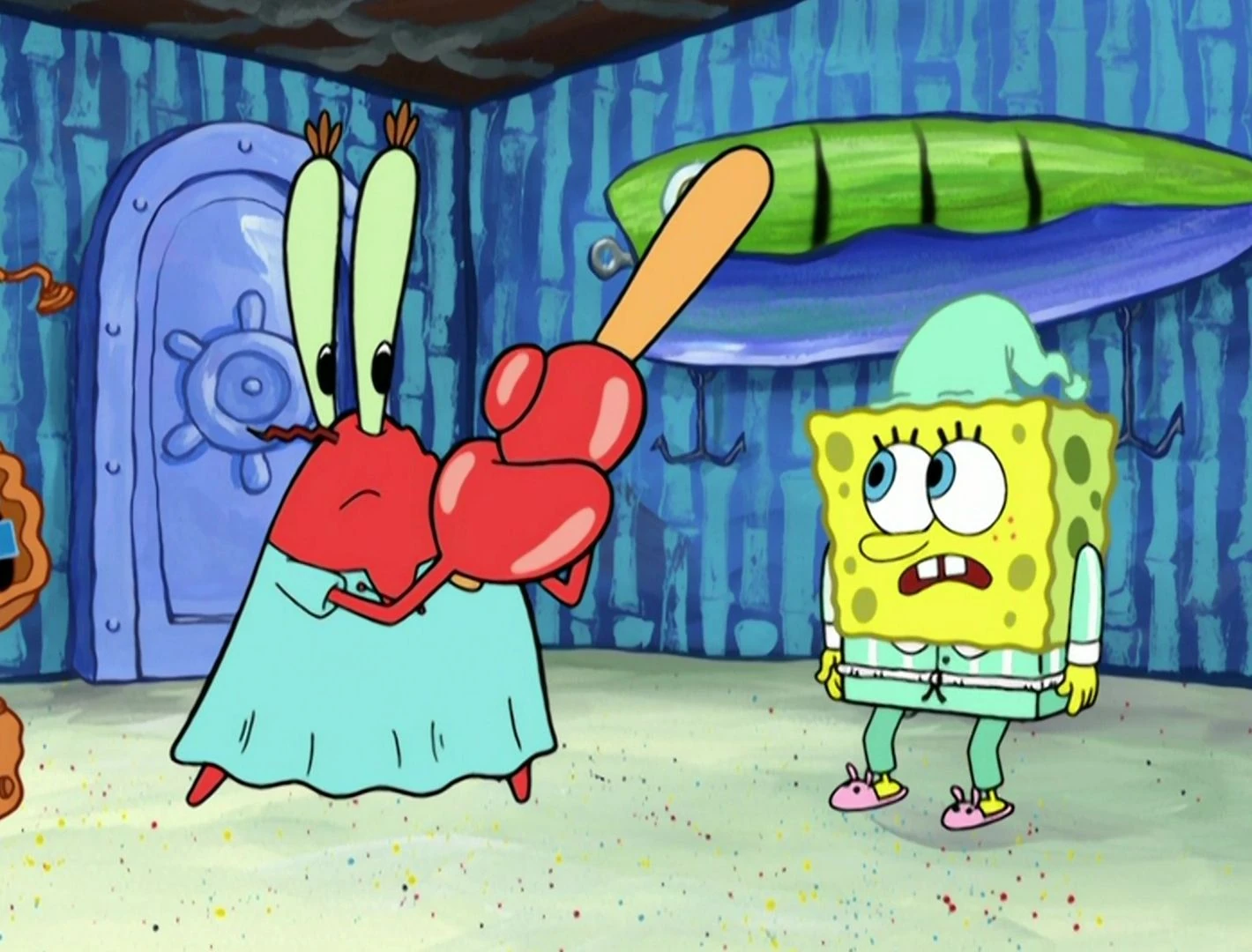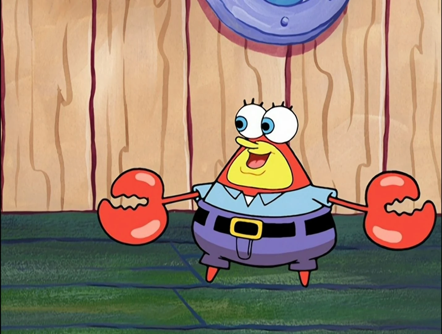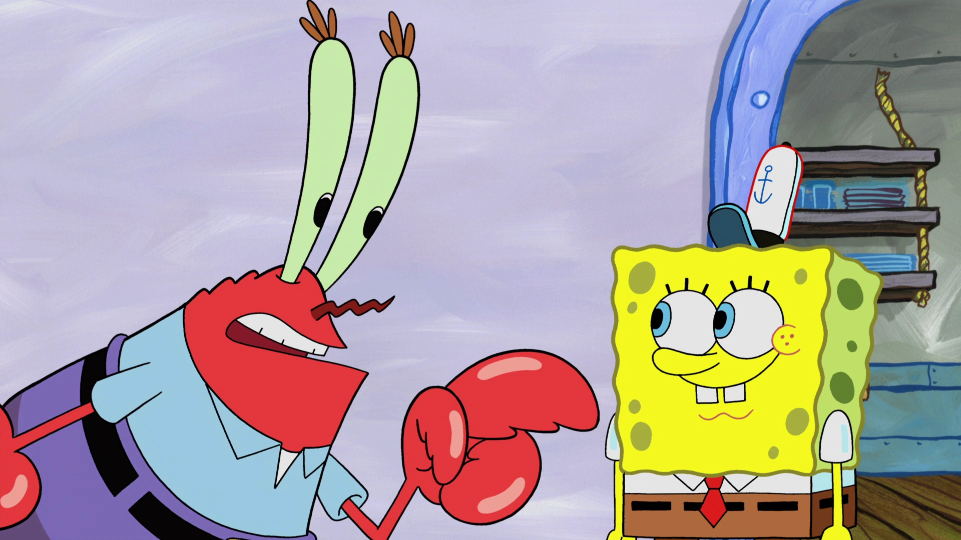 - In "Can You Spare a Dime?," He picked up Mr. Krabs tightly by the neck out of frustration and anger and yelled at him.