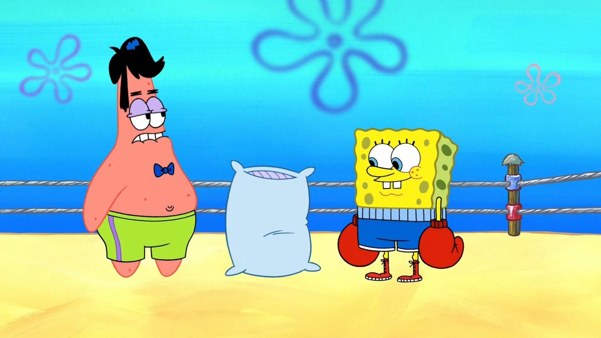 - In "The Bully," Flats the Flounder repeatedly threatens to beat up SpongeBob. However, he finally did only to find out that due to his "Sponginess" he was immune. Flats tried for days until finally (at Boating School) he collapsed from exhaustion. SpongeBob then gives a speech about it while making a fist gesture. Hence, Mrs. Puff thought he had beaten him up intentionally, thus screaming "I'M GOING TO KICK YOUR BUTT!"